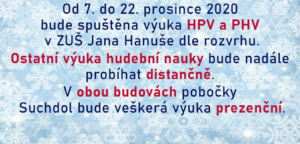 Od 7. do 22. prosince 2020 bude spuštěna výuka HPV a PHV v ZUŠ Jana Hanuše dle rozvrhu.