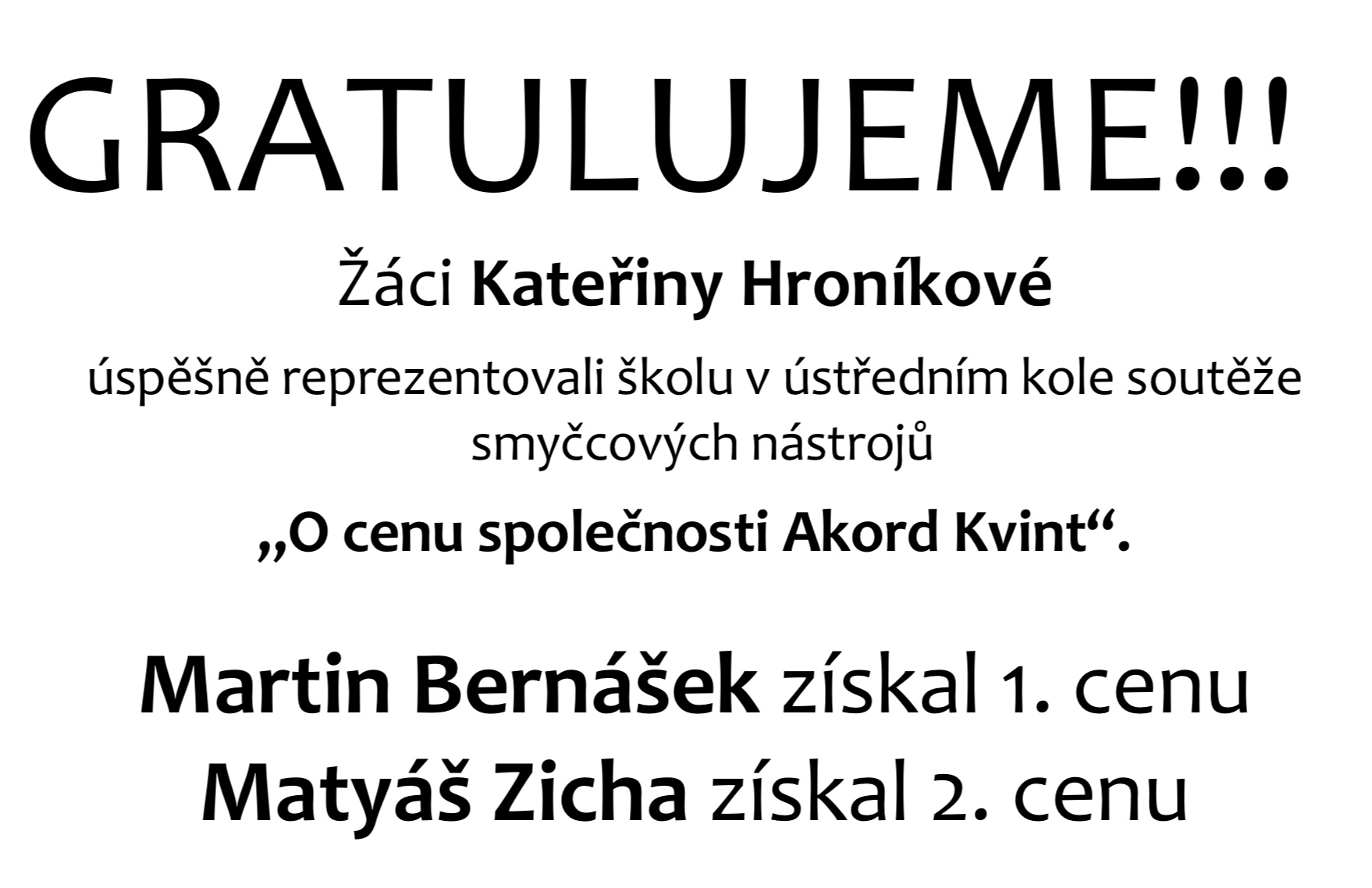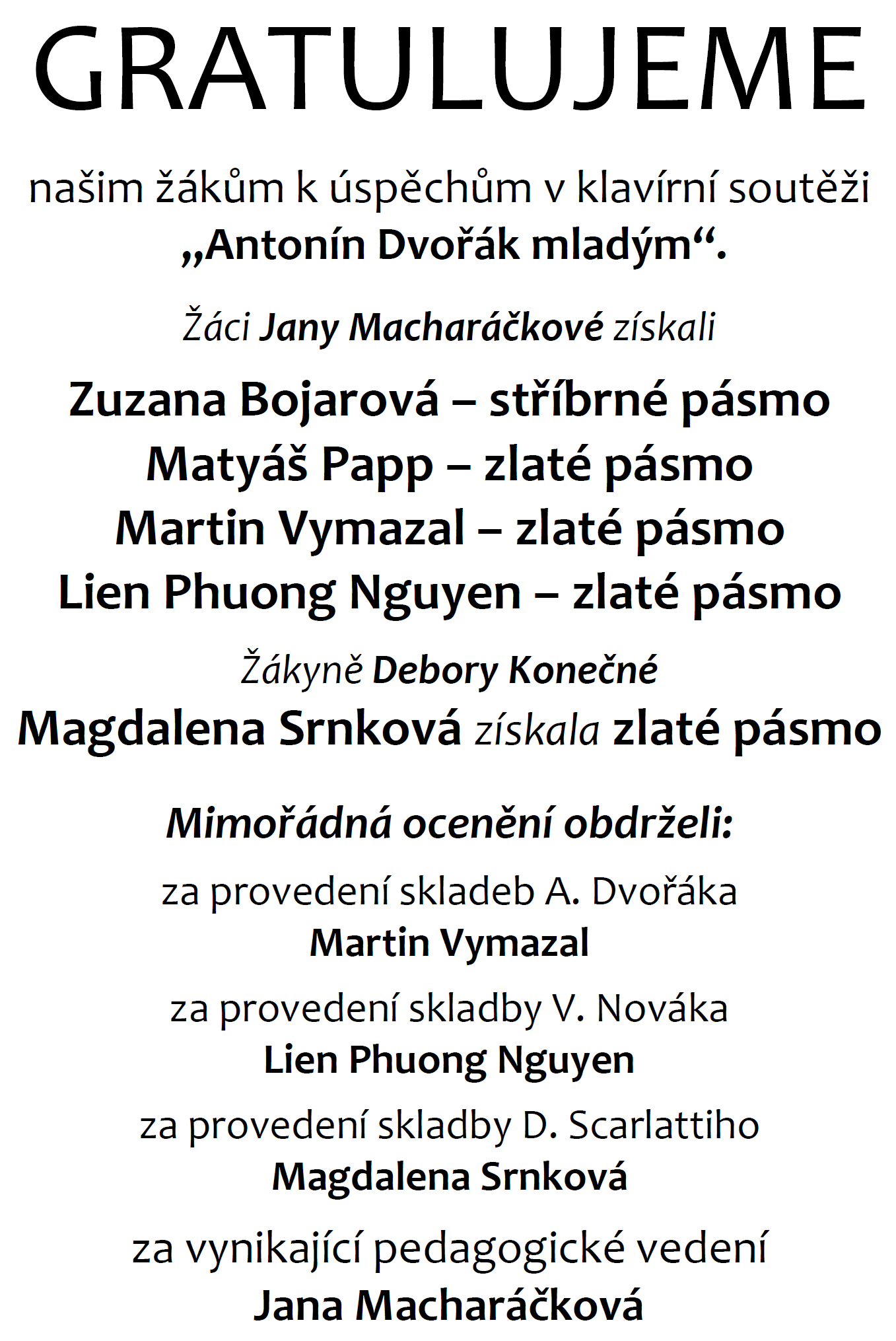 Gratulujeme – úspěchy našich žáků v soutěžní přehlídce „Antonín Dvořák mladým“