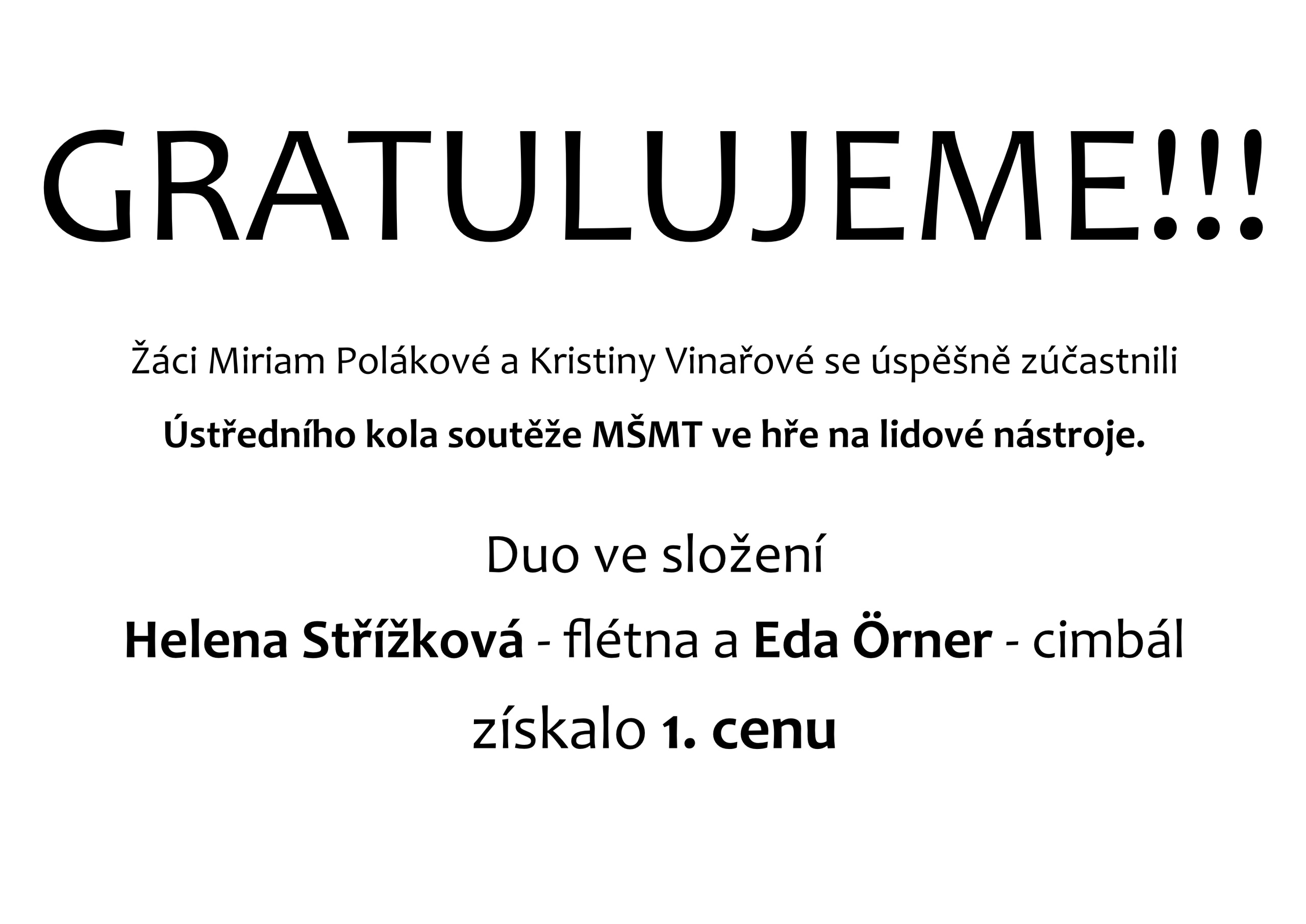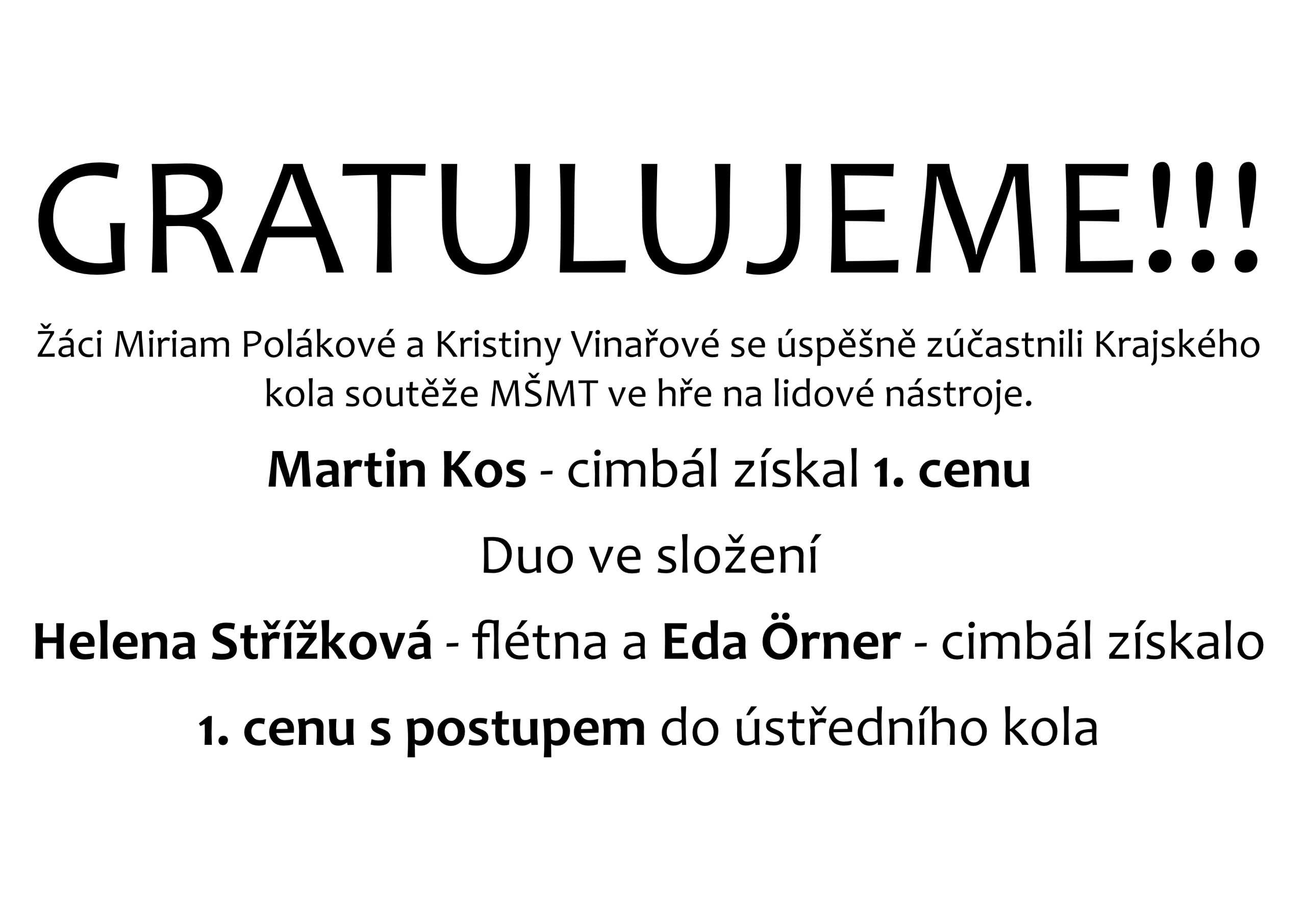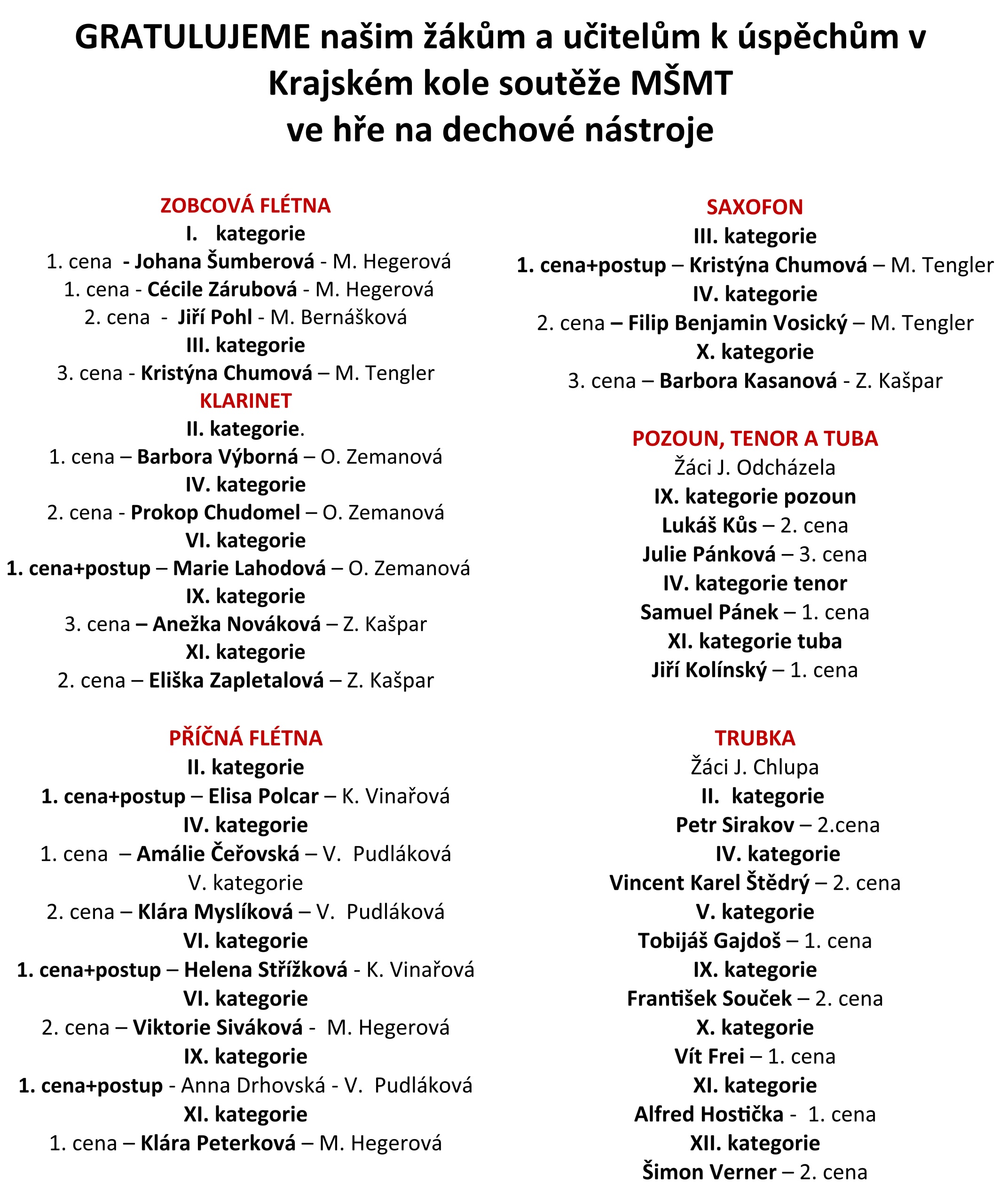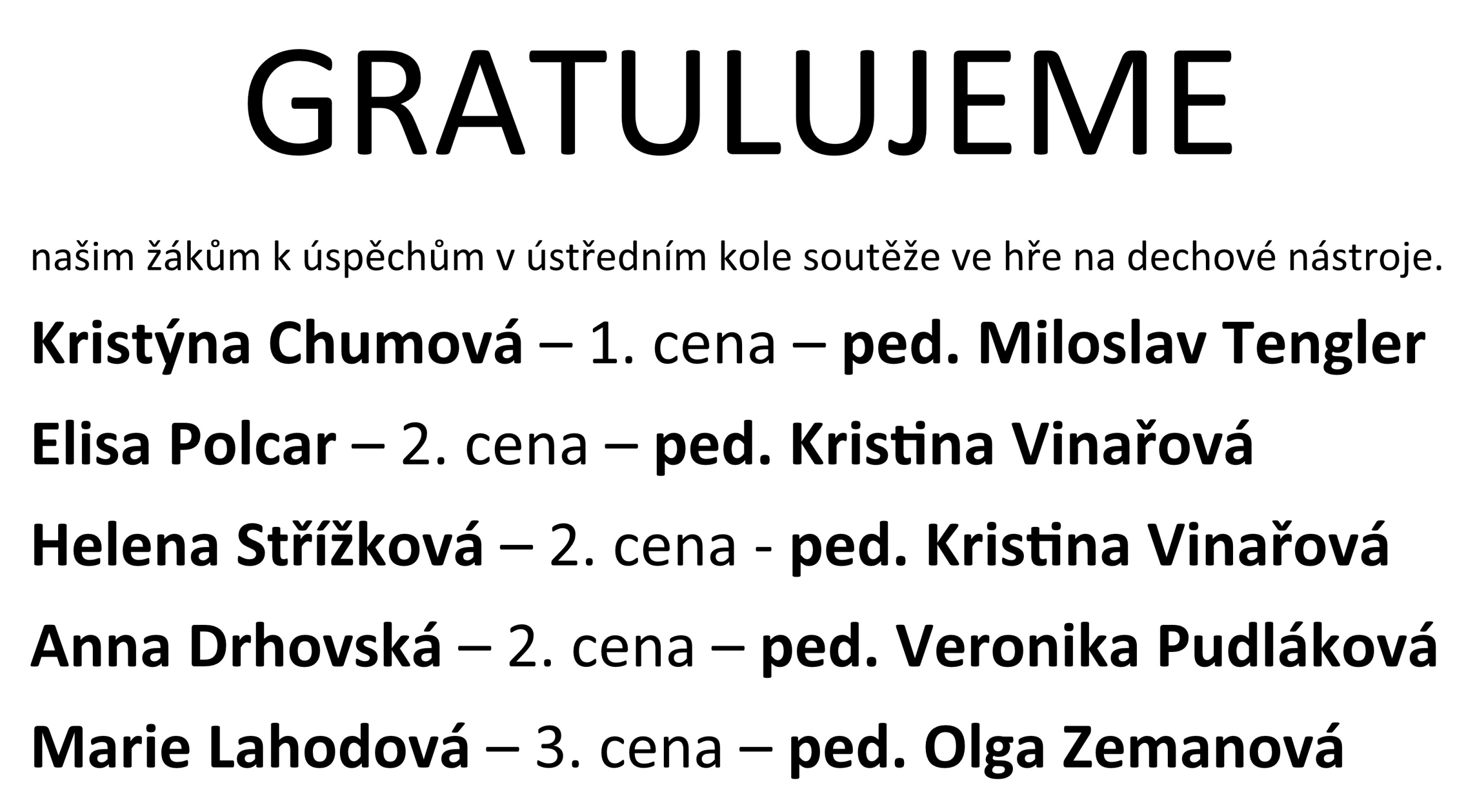 Gratulujeme – našim žákům k úspěchům v ústředním kole soutěže ve hře na dechové nástroje
