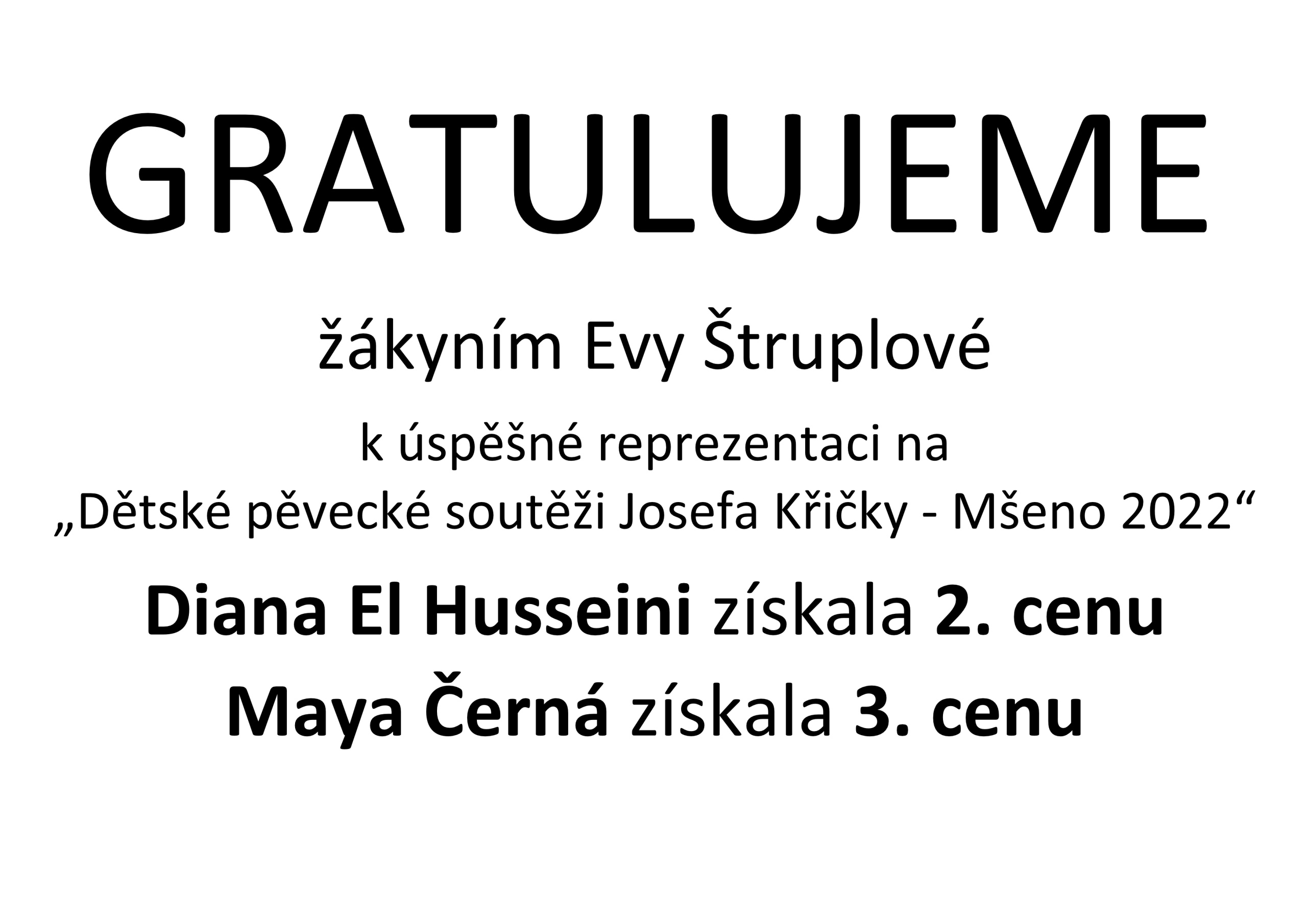 Gratulujeme – úspěchy žáků Evy Štruplové na „Dětské pěvecká soutěži Josefa Křičky – Mšeno 2022“