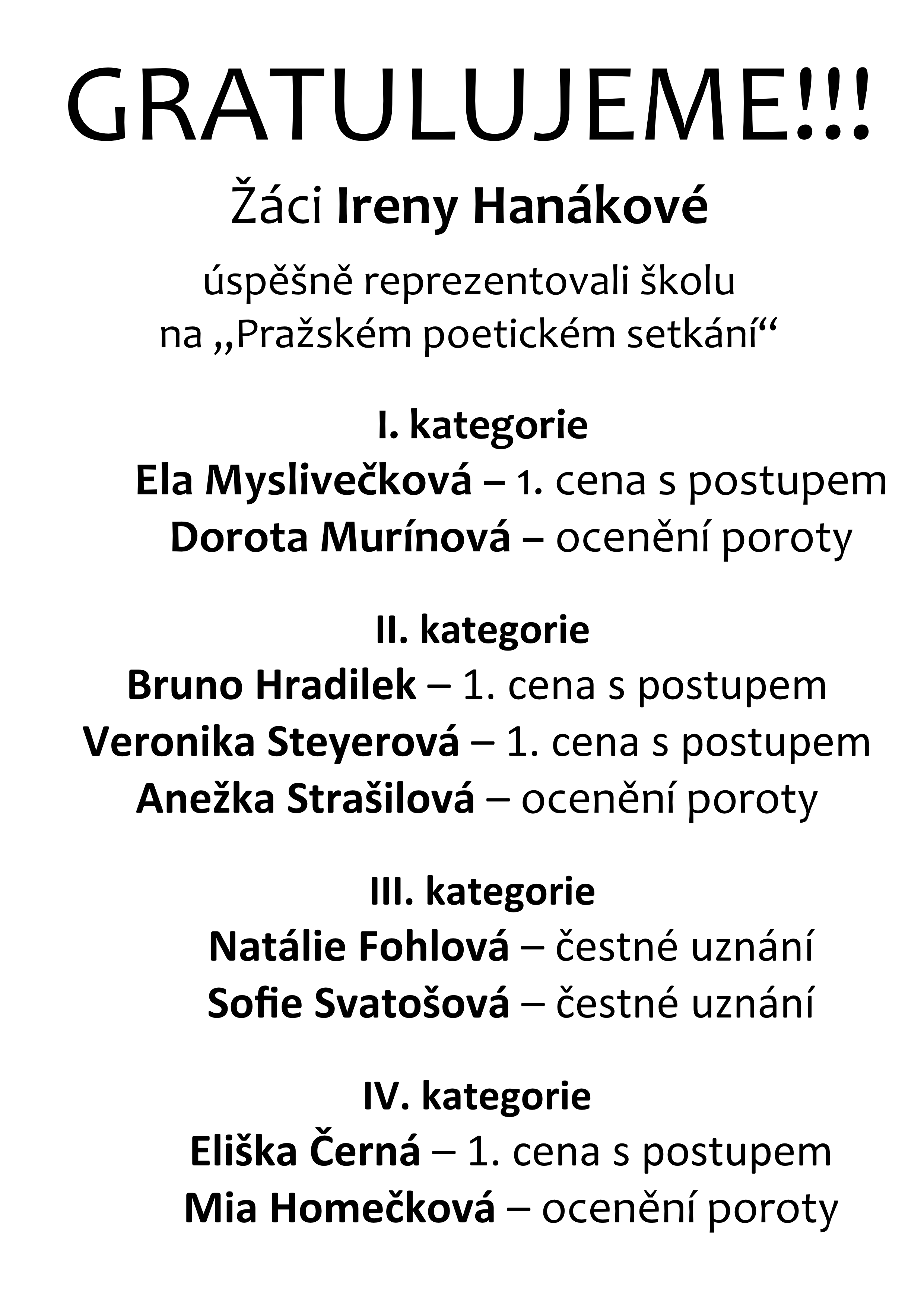 Gratulujeme – úspěchy žáků Ireny Hanákové v „Pražském poetickém setkání“