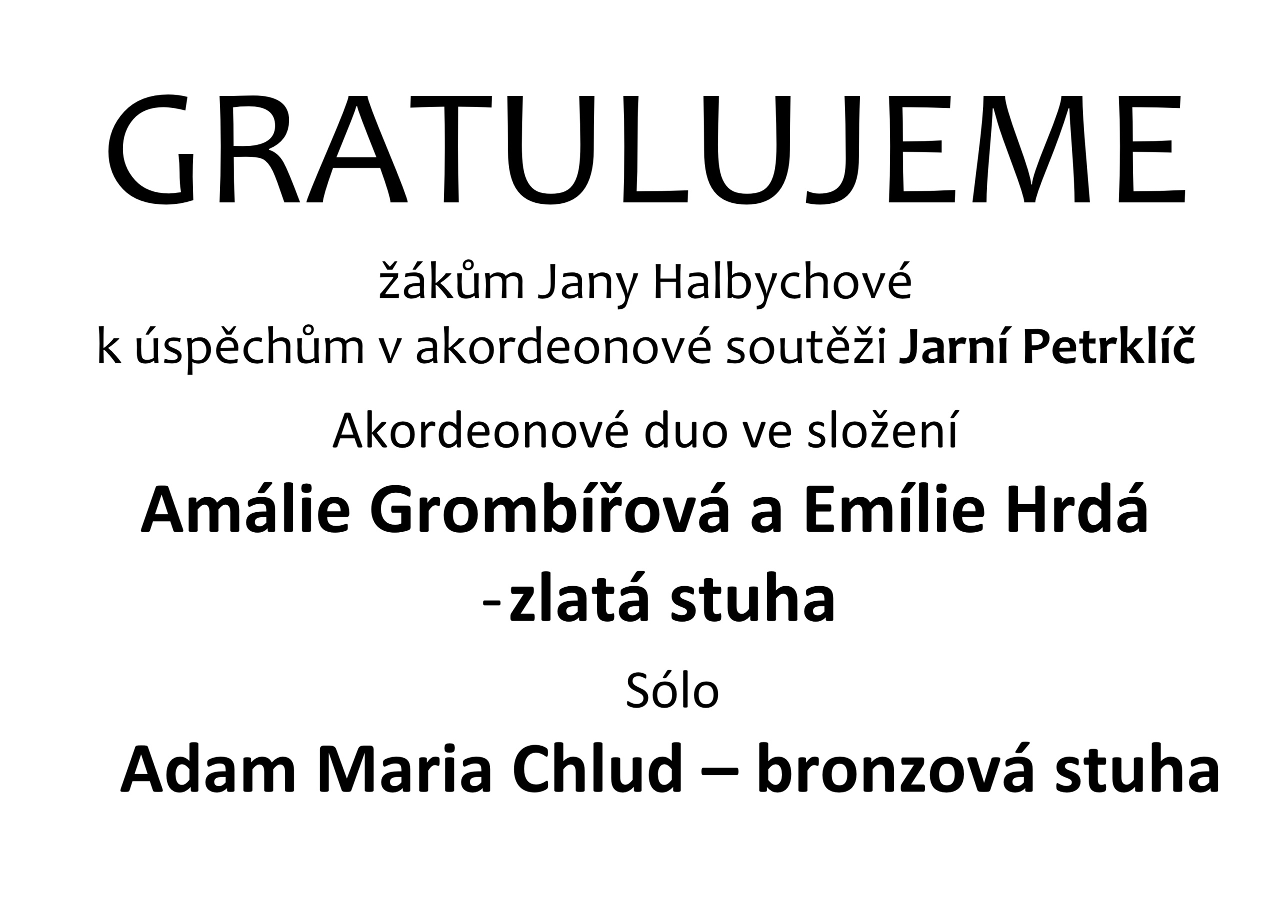 Gratulujeme – žákům Jany Halbychové k úspěchům v akordeonové soutěži Jarní Petrklíč