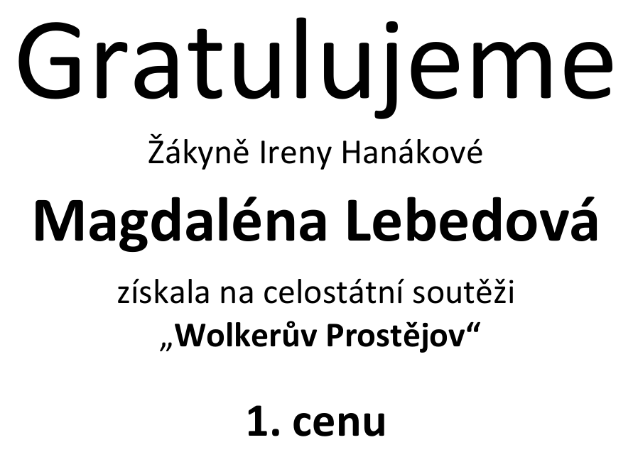 Gratulujeme – 1. cena v celostátní soutěži „Wolkerův Prostějov“: Magdaléna Lebedová