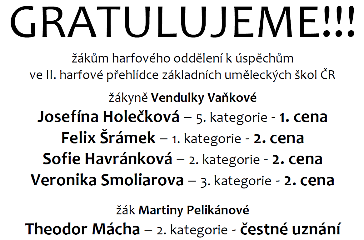 Gratulujeme – úspěchy našich žáků v II. harfové přehlídce základních uměleckých škol ČR