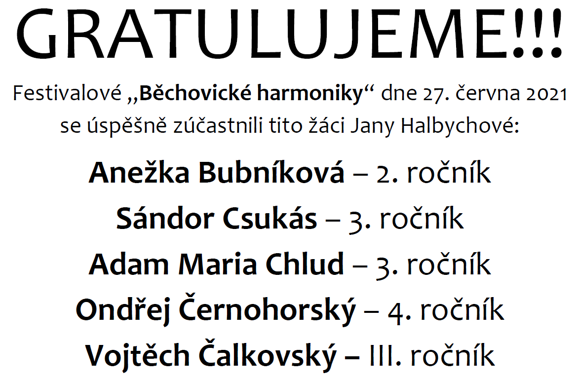 Gratulujeme – úspěchy našich žáků na festivalové přehlídce „Běchovická harmonika“
