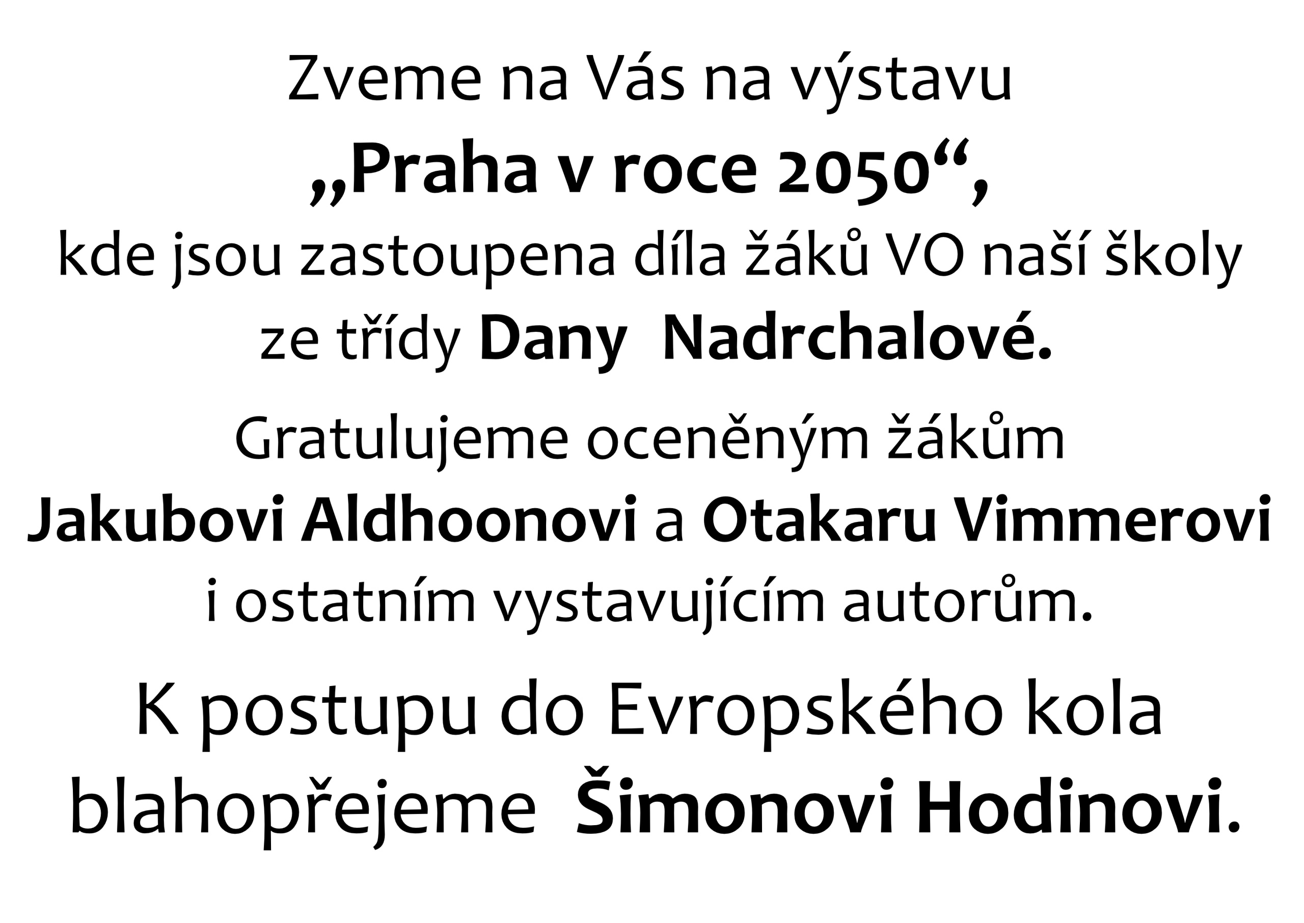 Gratulujeme – žákům výtvarného oddělení k ocenění na výstavě „Praha v roce 2050“ a k postupu do Evropského kola