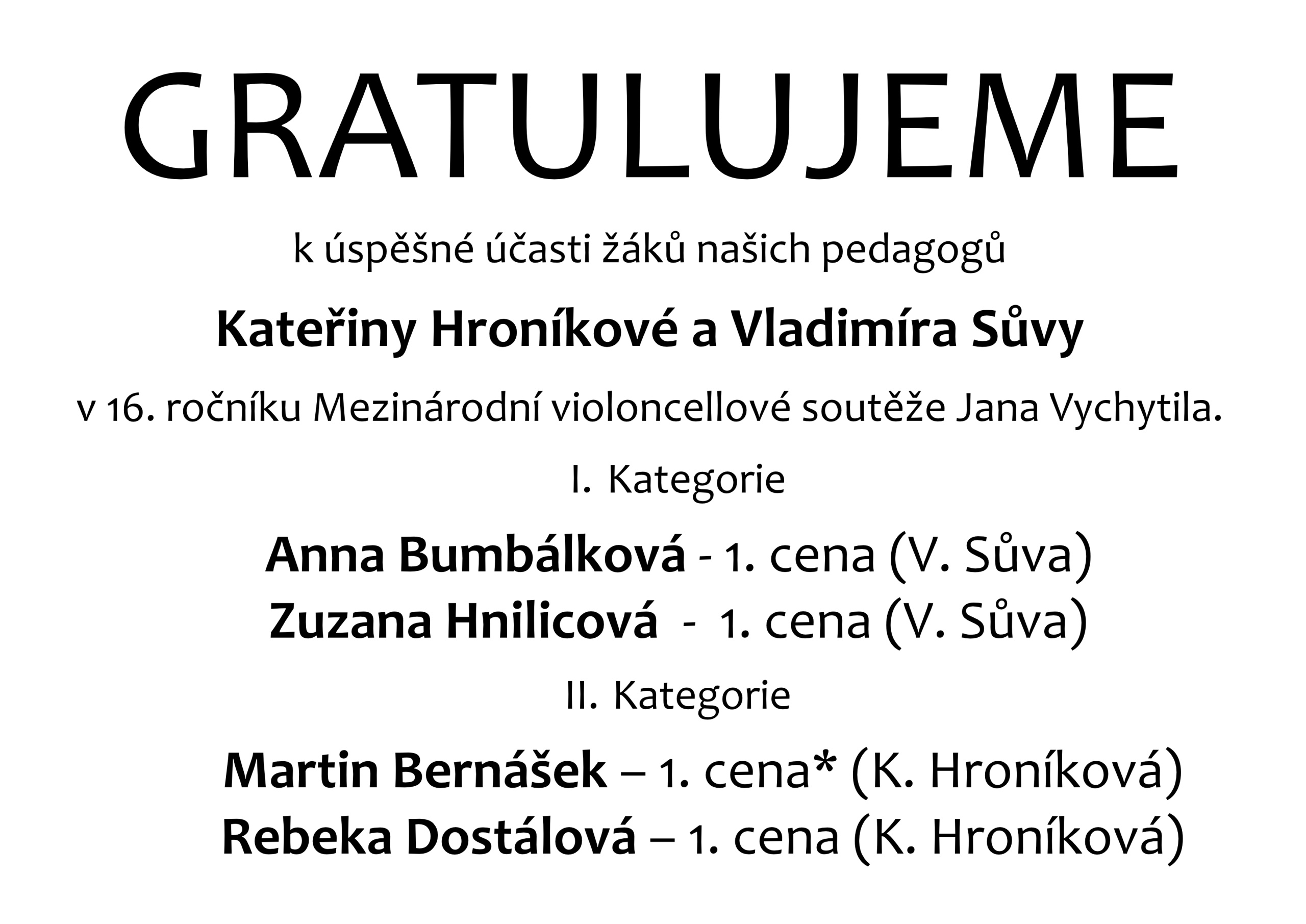 Gratulujeme – žáci K. Honíkové a V. Súvy získali 1. cenu v 16. ročníku Mezinárodní violoncellové soutěže Jana Vychytila