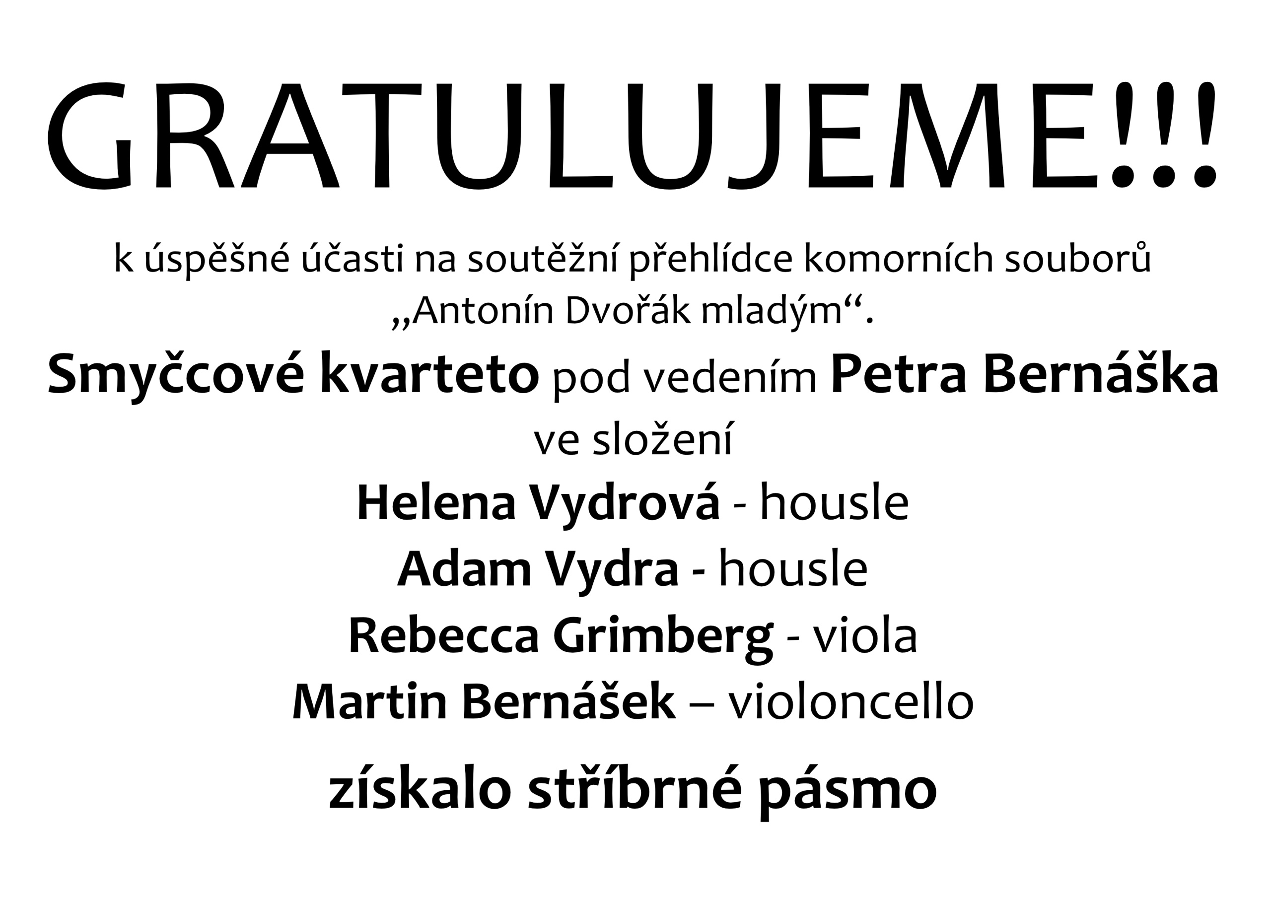 Gratulujeme – úspěšná účast smyčcového kvarteta pod vedení Petra Bernáška v soutěžní přehlídce „Antonín Dvořák mladým“