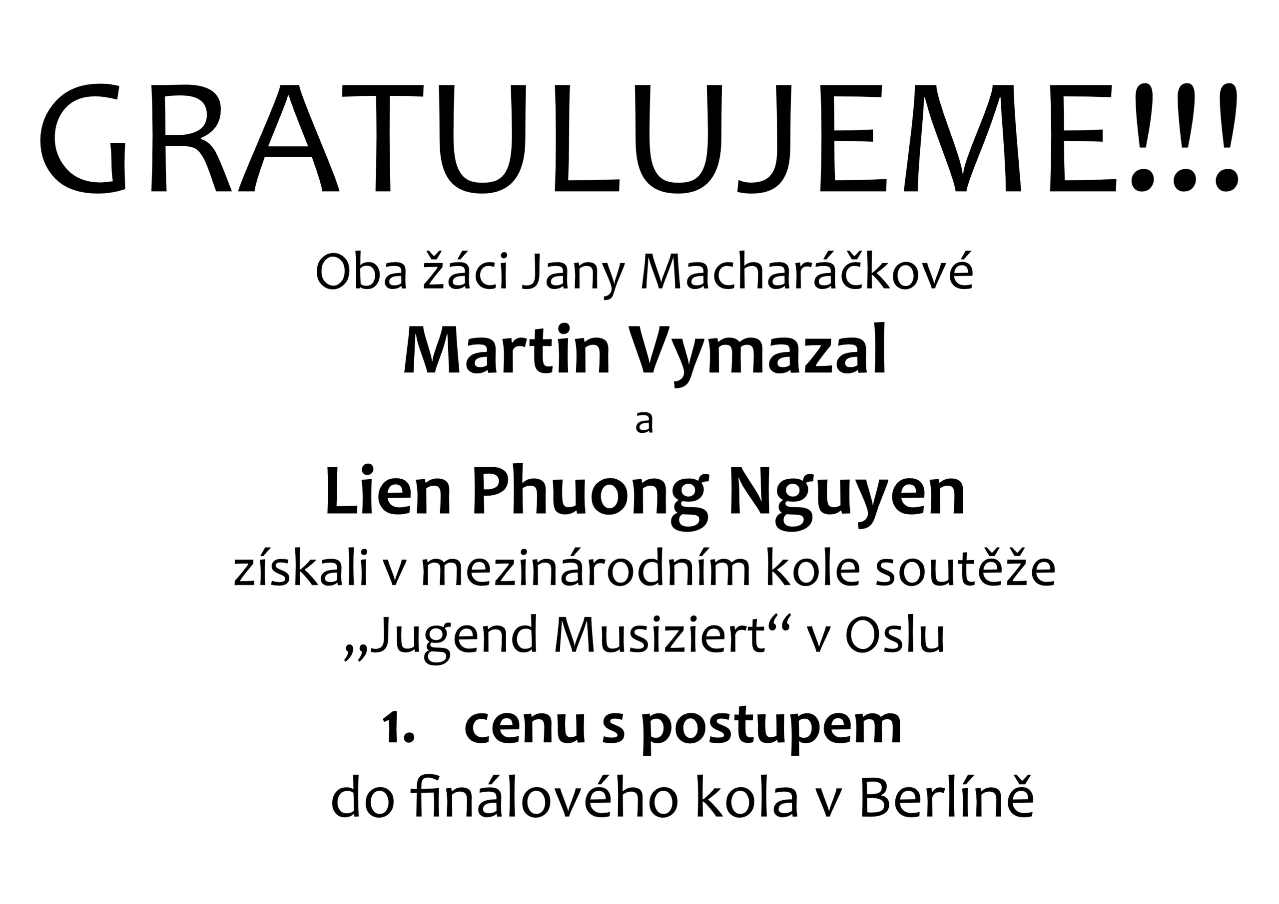Gratulujeme –  žákům Jany Macharáčkové – 1. cena s postupem v soutěží„Jugend Musiziert“ v Oslu