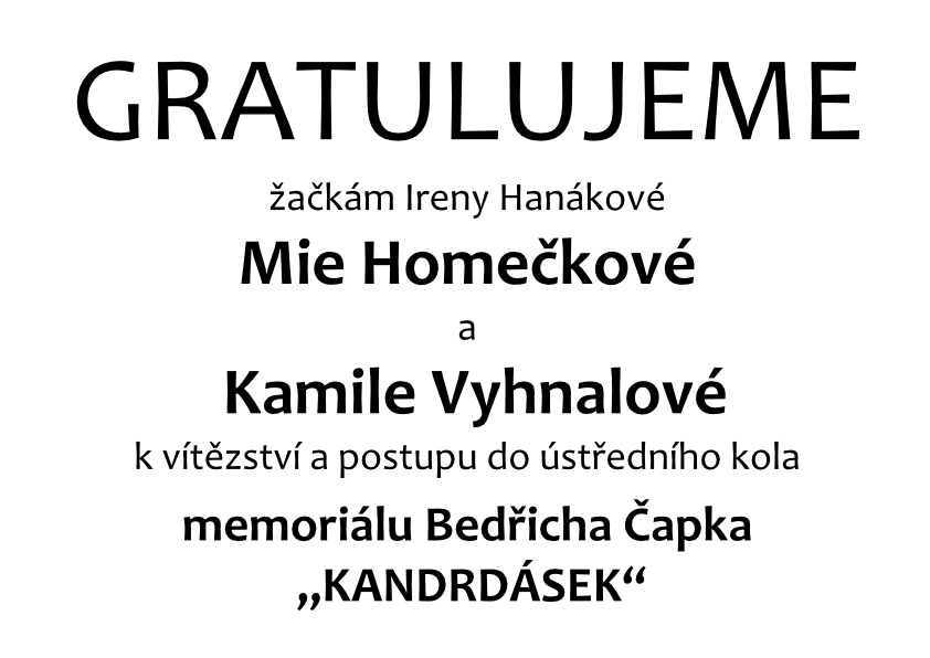 Gratulujeme – žákyním Ireny Hanákové Mie Homečkové a Kamile Vyhnalové k vítězství a postupu do ústředního kola memoriálu Bedřicha Čapka „KANDRDÁSEK“