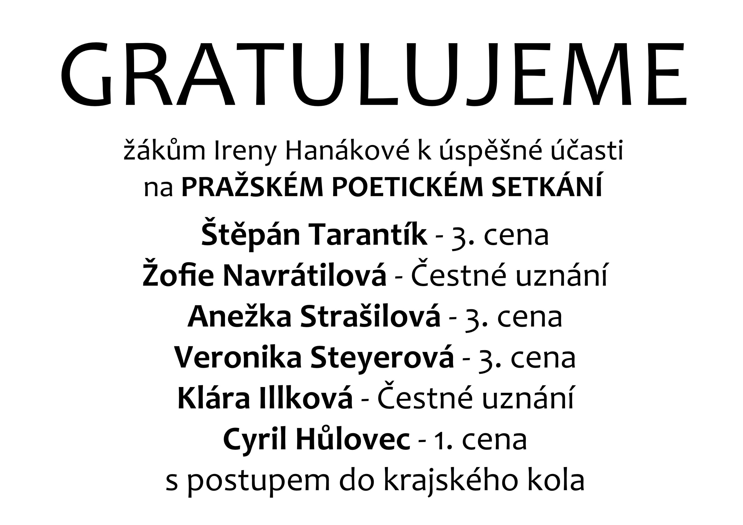 Gratulujeme – žákům Ireny Hanákové na Pražském poetickém setkání