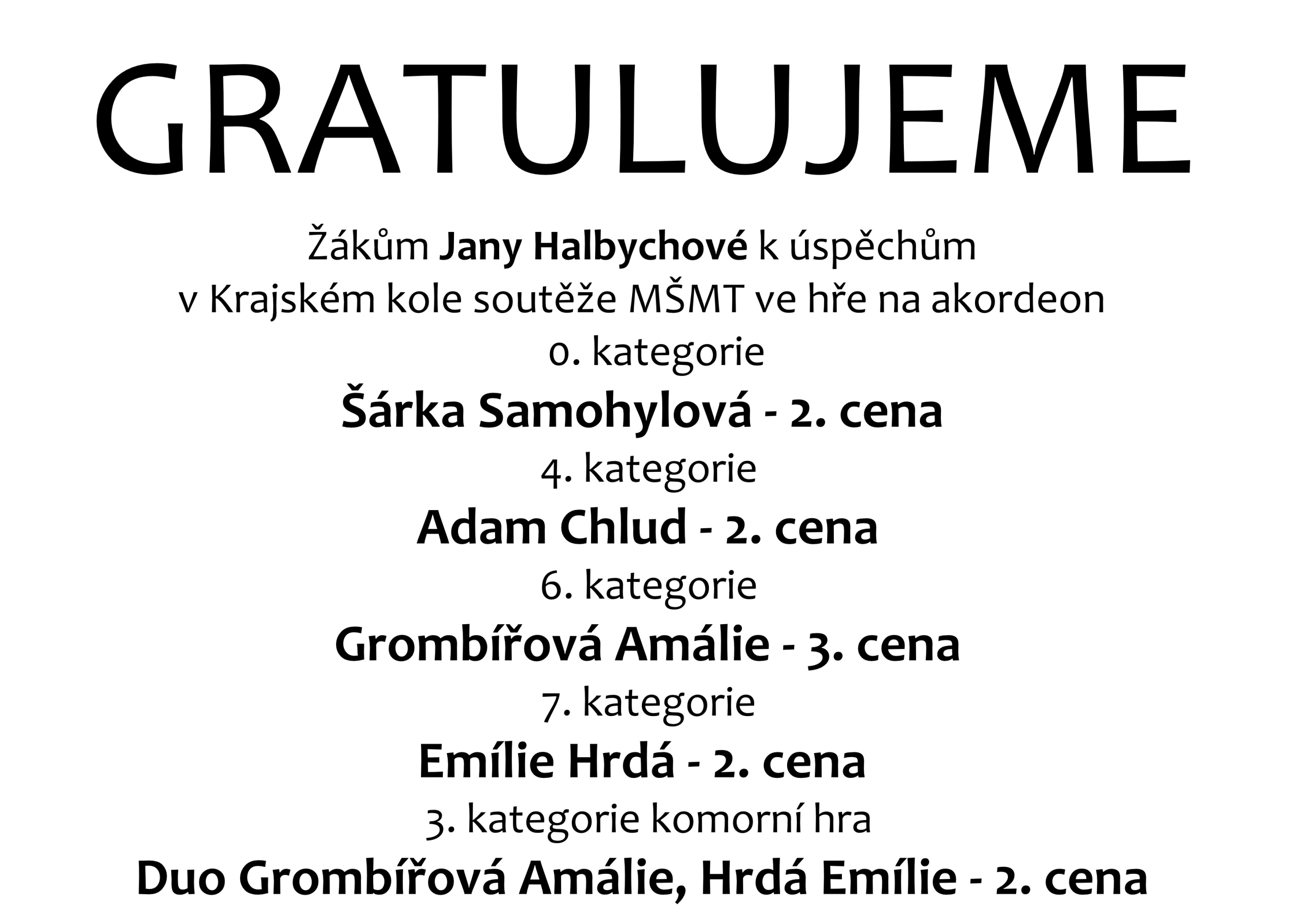 Gratulujeme -Žákům Jany Halbychové k úspěchům v Krajském kole soutěže MŠMT ve hře na akordeon