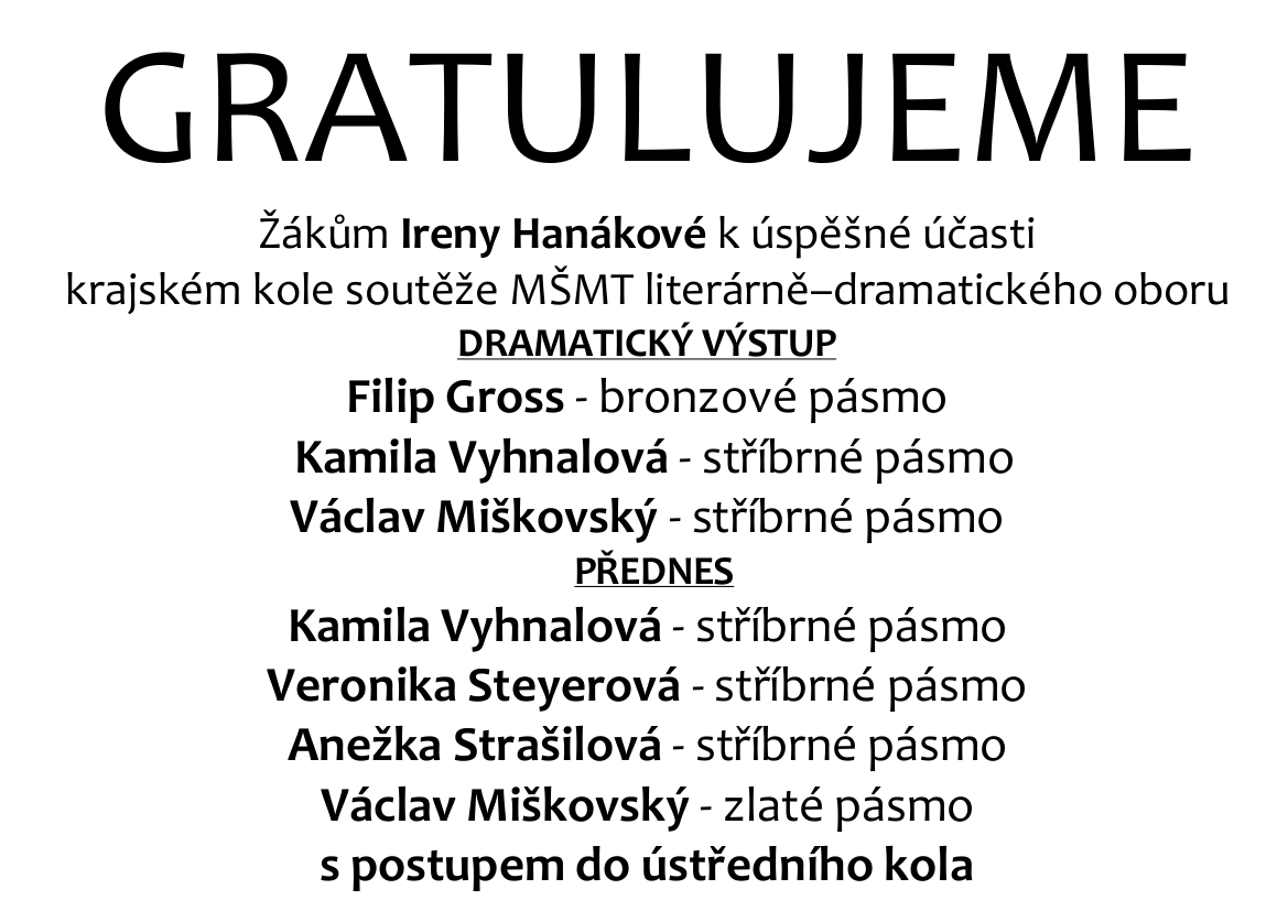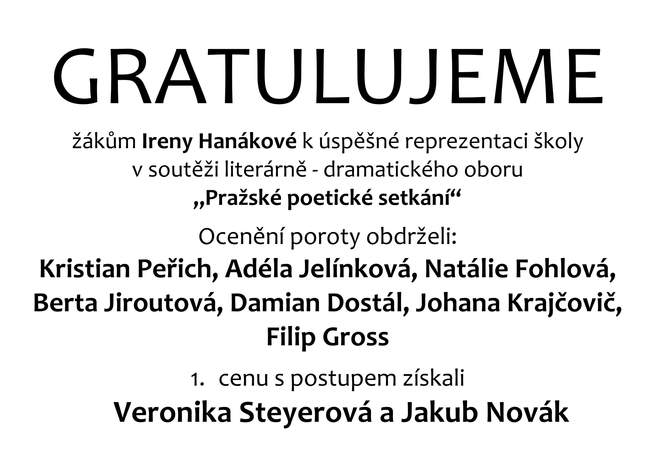 Gratulujeme – žákům Ireny Hanákové k ocenění v soutěži Pražské poetické setkání