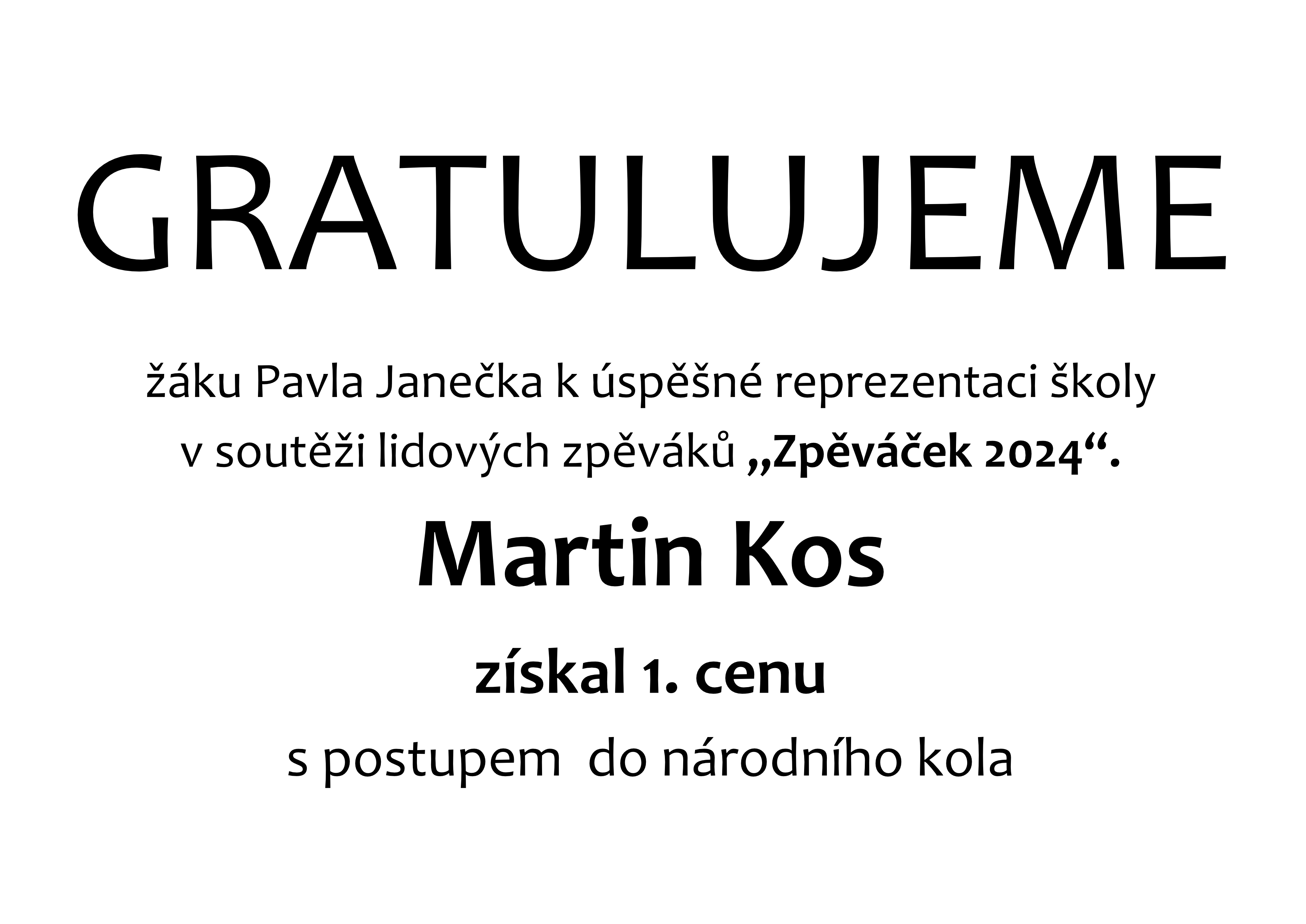 Gratulujeme – Martin Kos pod vedením Pavla Janečka získal 1. cenu v soutěži „Zpěváček 2024“