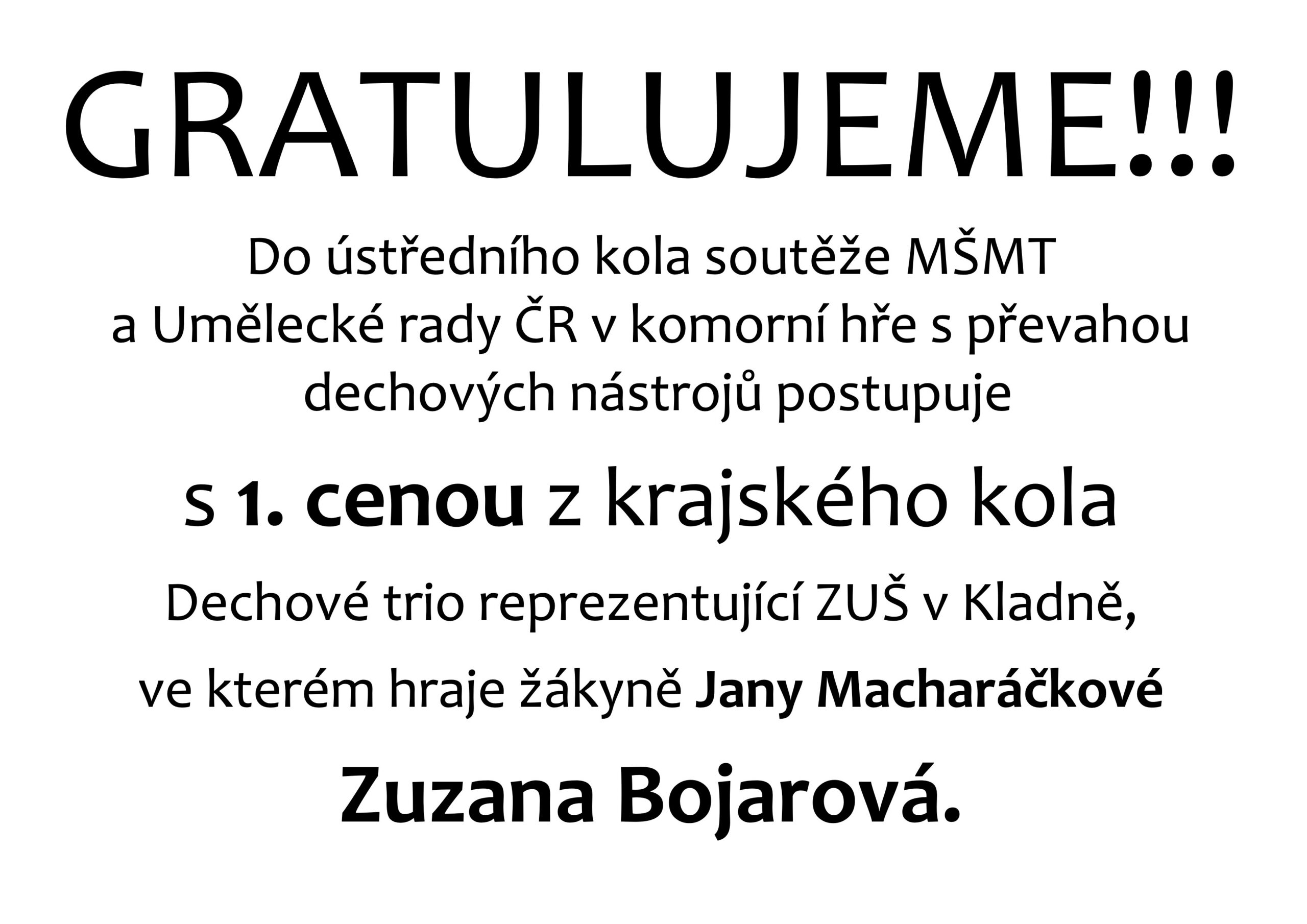 Gratulujeme -Do ústředního kola soutěže MŠMT a Umělecké rady ČR  postupuje z krajského kola Dechové trio reprezentující ZUŠ v Kladně, ve kterém hraje žákyně Jany Macharáčkové Zuzana Bojarová.
