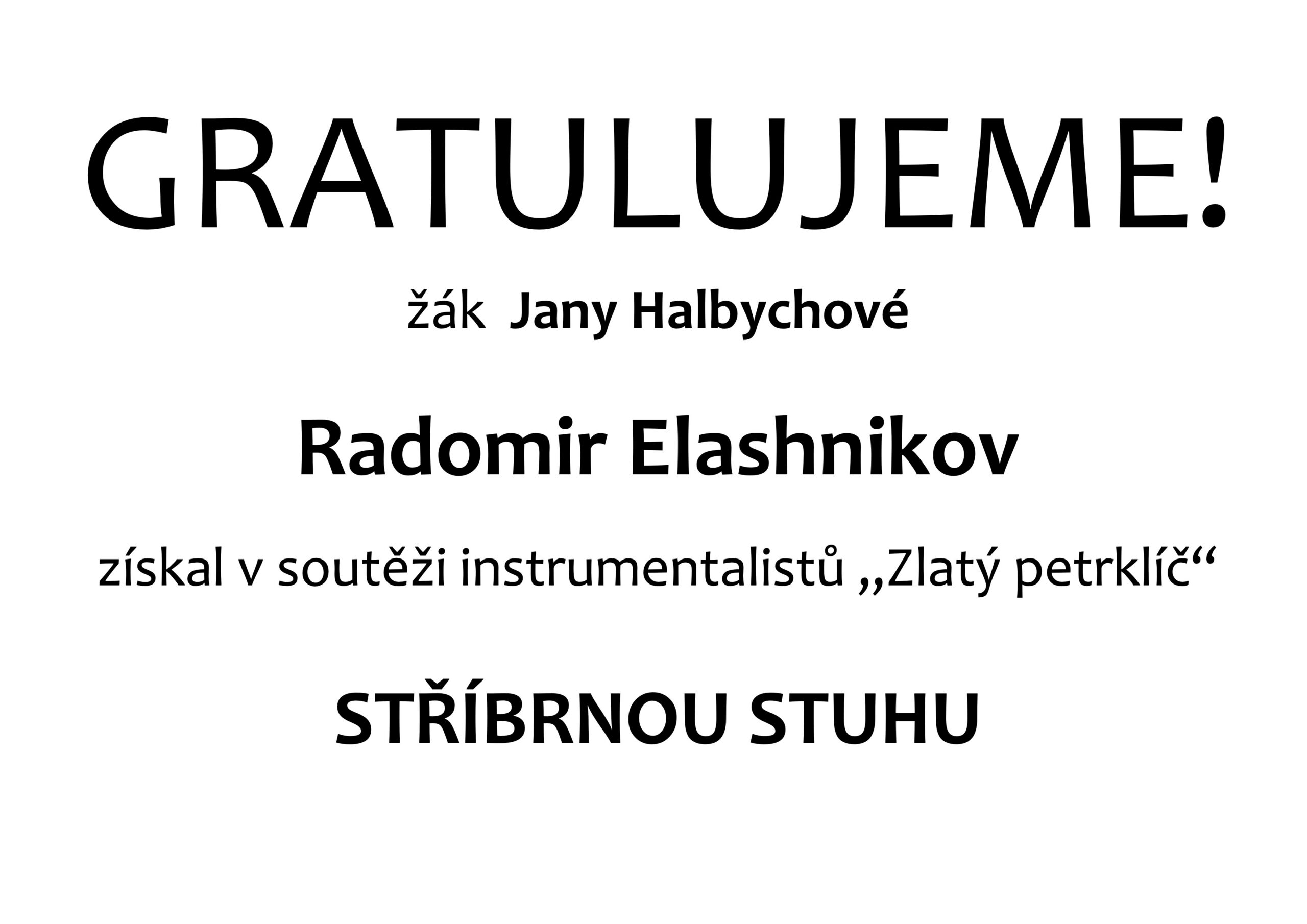 Gratulujeme – žák Jany Halbychové Radomir Elashnikov získal v soutěži instrumentalistů „Zlatý petrklíč“ STŘÍBRNOU STUHU