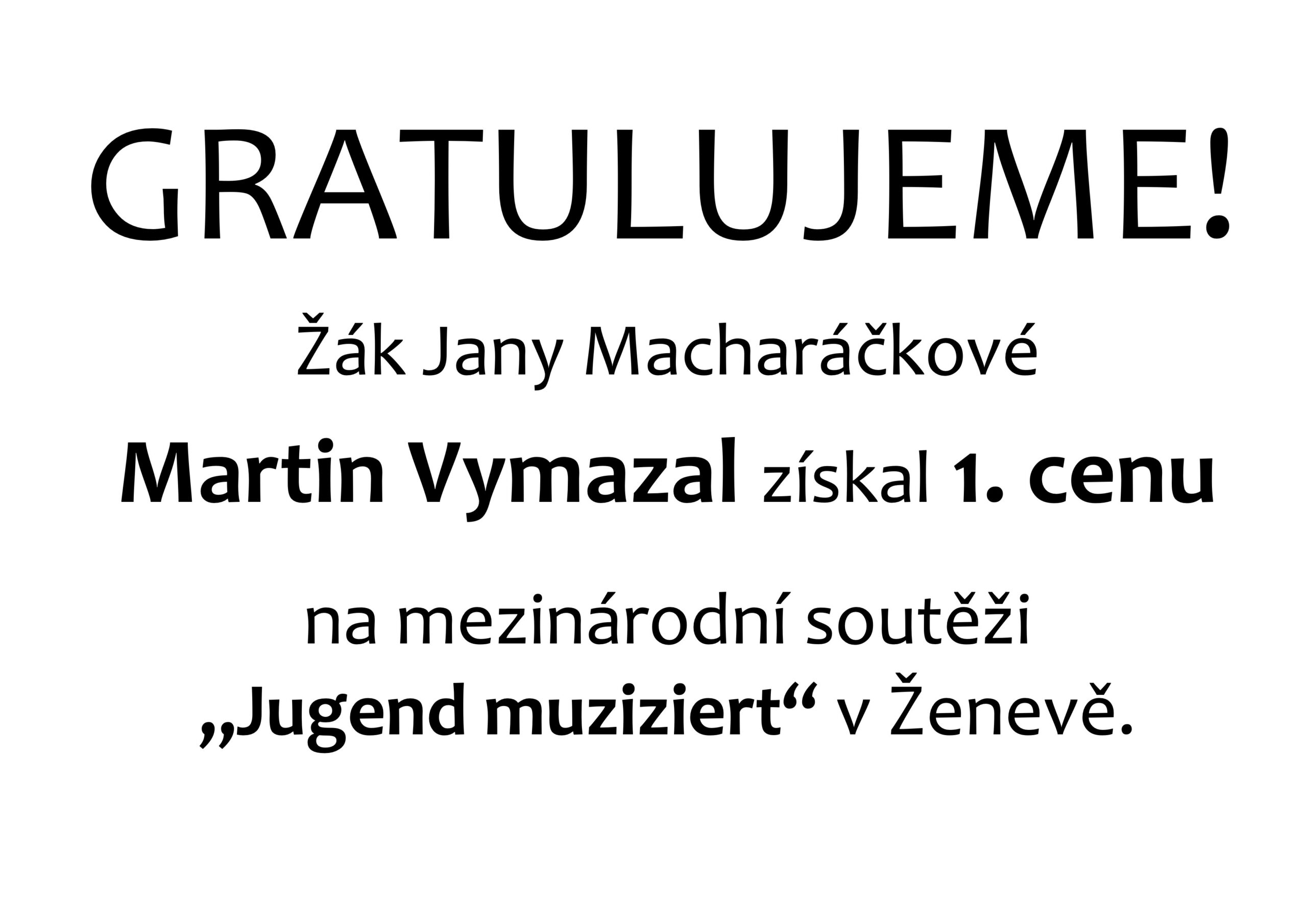 Gratulujeme –  žák Jany Macharáčkové Martin Vymazal získal 1. cenu na mezinárodní soutěži „Jugend muziziert“ v Ženevě
