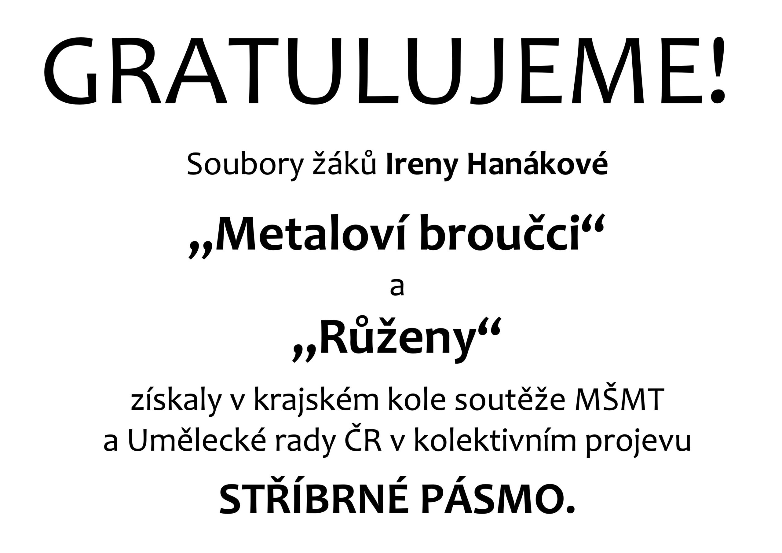 Gratulujeme –  souborům Ireny Hanákové „Metaloví broučci“ a „Růženy“ k úspěchům v soutěži MŠMT a Umělecké rady ČR v kolektivním projevu