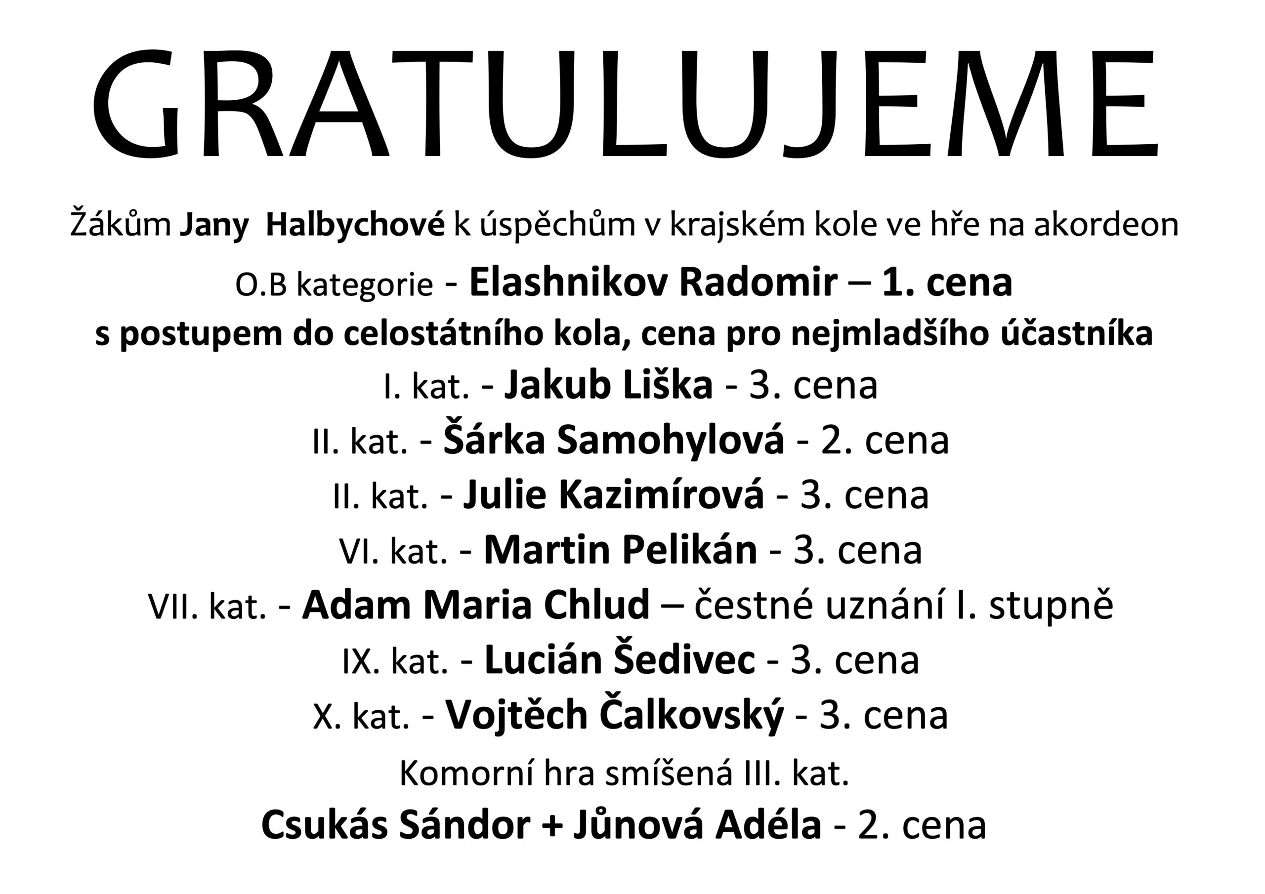 Gratulujeme  – žákům Jany Halbychové k úspěchům v krajském kole soutěže ve hře na akordeon