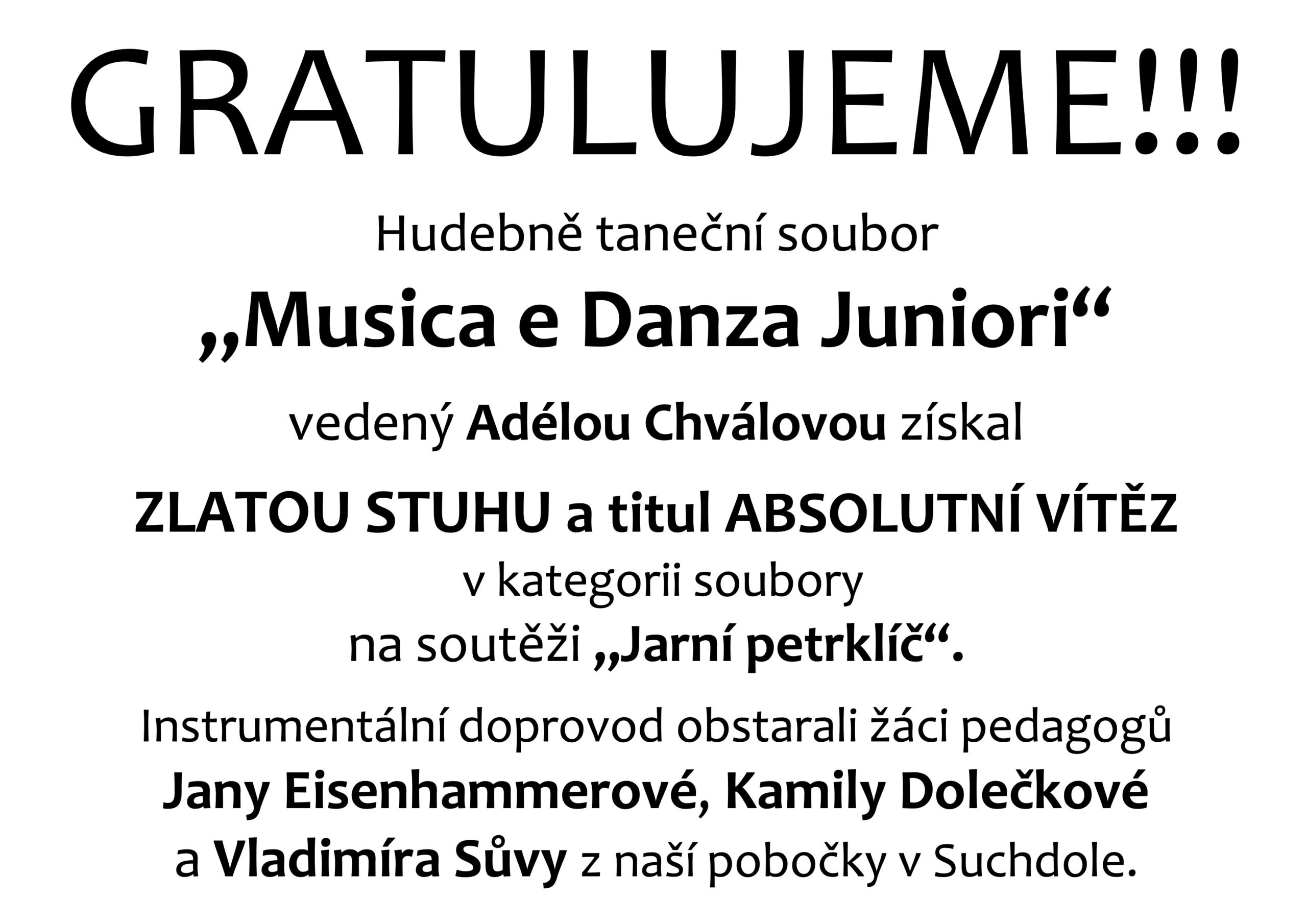 Gratulujeme –  tanecní soubor „Musica e Danza Juniori“ vedený Adélou Chválovou získal ZLATOU STUHU v soutězi „Jarní petrklíč“
