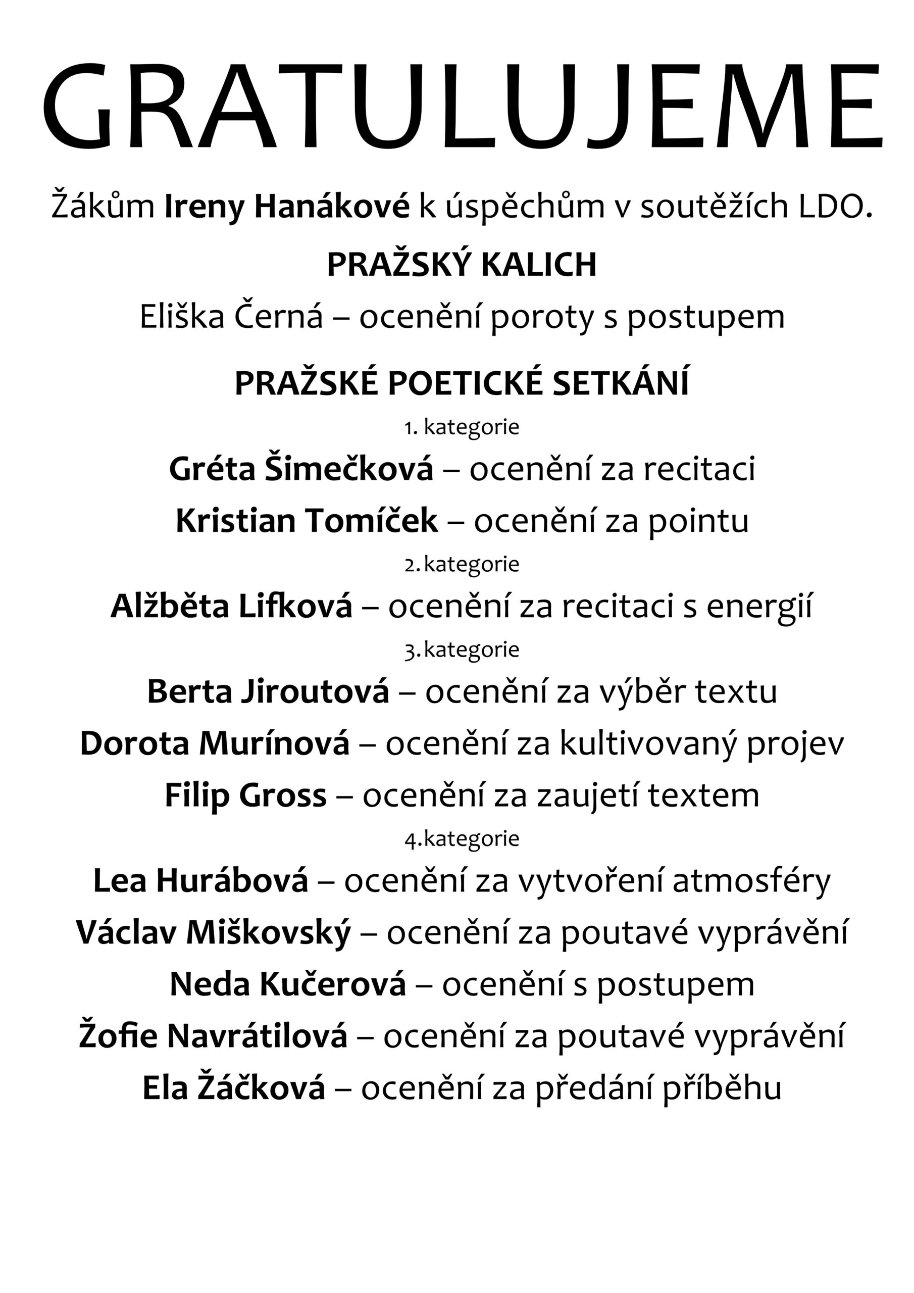 Gratulujeme  – žákům Ireny Hanákové k úspěchům v soutěžích PRAŽSKÝ KALICH a PRAŽSKÉ POETICKÉ SETKÁNÍ