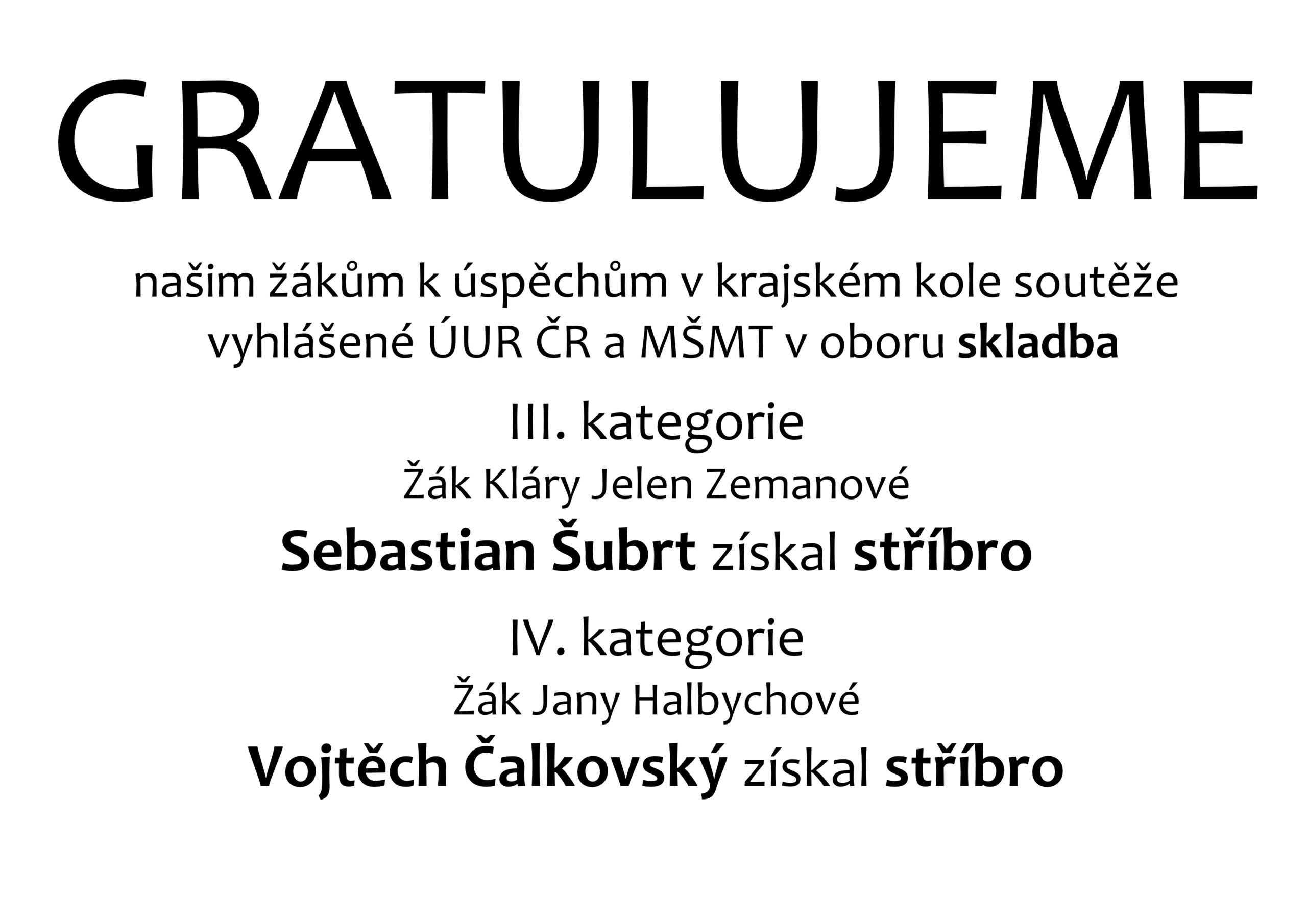 Gratulujeme  – našim žákům k úspěchům v krajském kole soutěže vyhlášené ÚUR ČR a MŠMT v oboru skladba