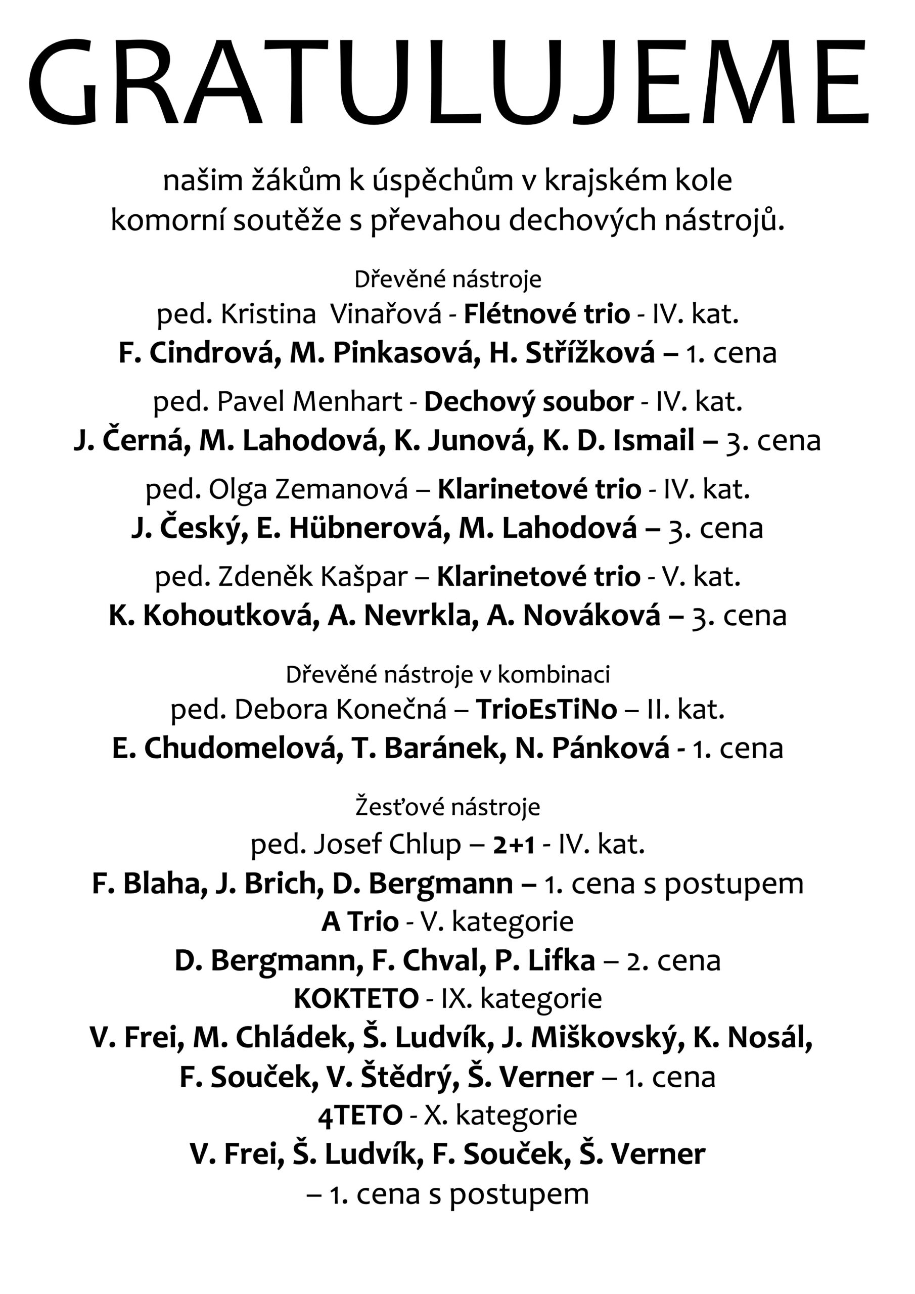 Gratulujeme – našim žákům k úspěchům v krajském kole komorní soutěže MŠMT s převahou dechových nástrojů